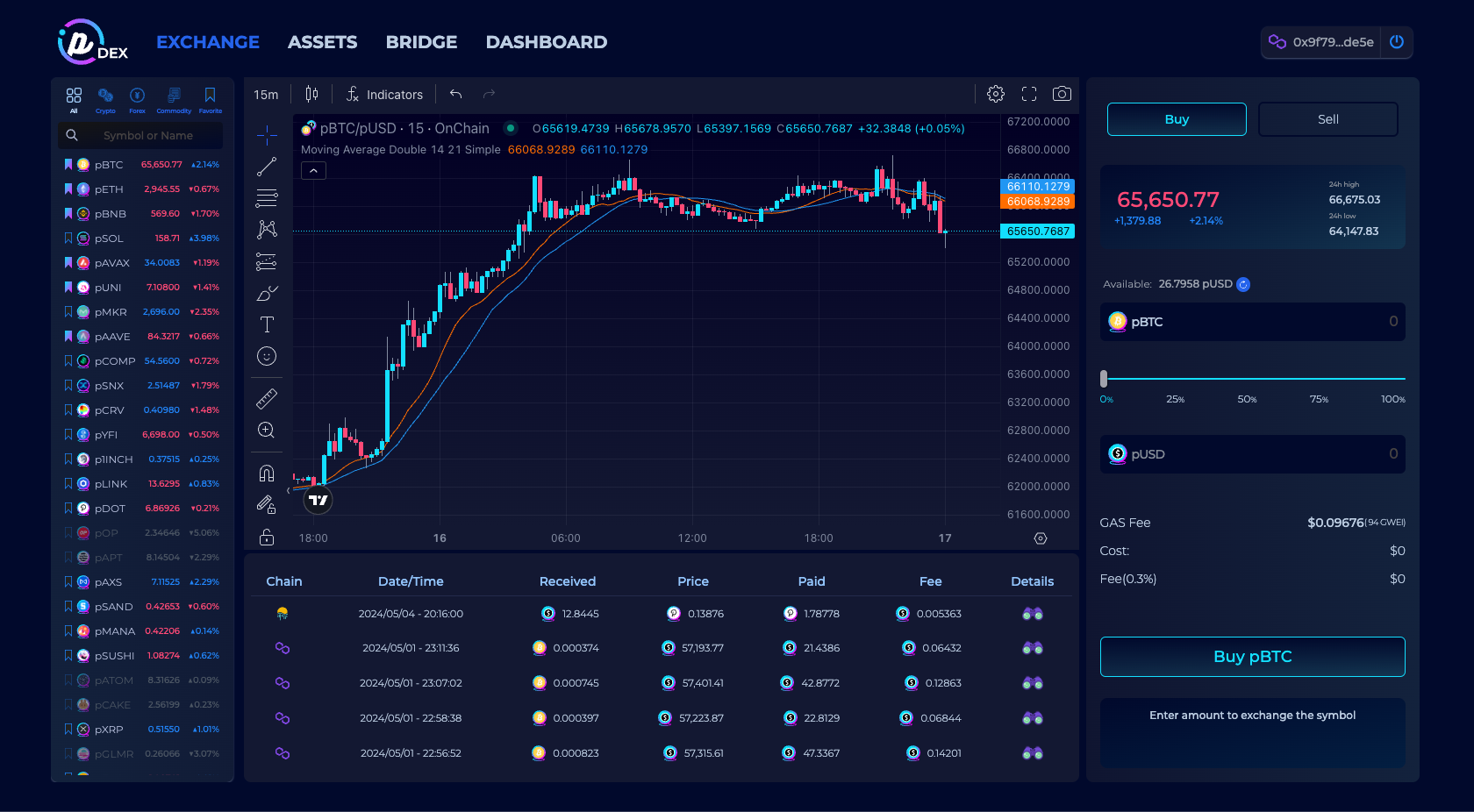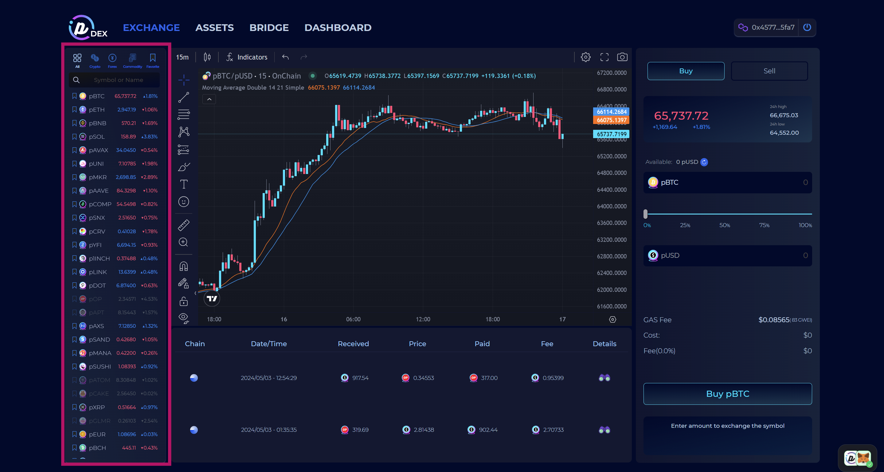 Various kinds of Pynths will be included such as a synthesized blockchain asset (pBTC, pETH, pBNB, etc), stocks(pTSLA, pGOOGL, pAMZN, etc), commodities (pXAU, pXAG, pWTI, etc.), inverse products(piBTC, piETH, piTSLA, piXAU, etc). Wide range of financial assets will provide to users by trade with the minted pUSD, and users don’t need to buy or hold the original assets.